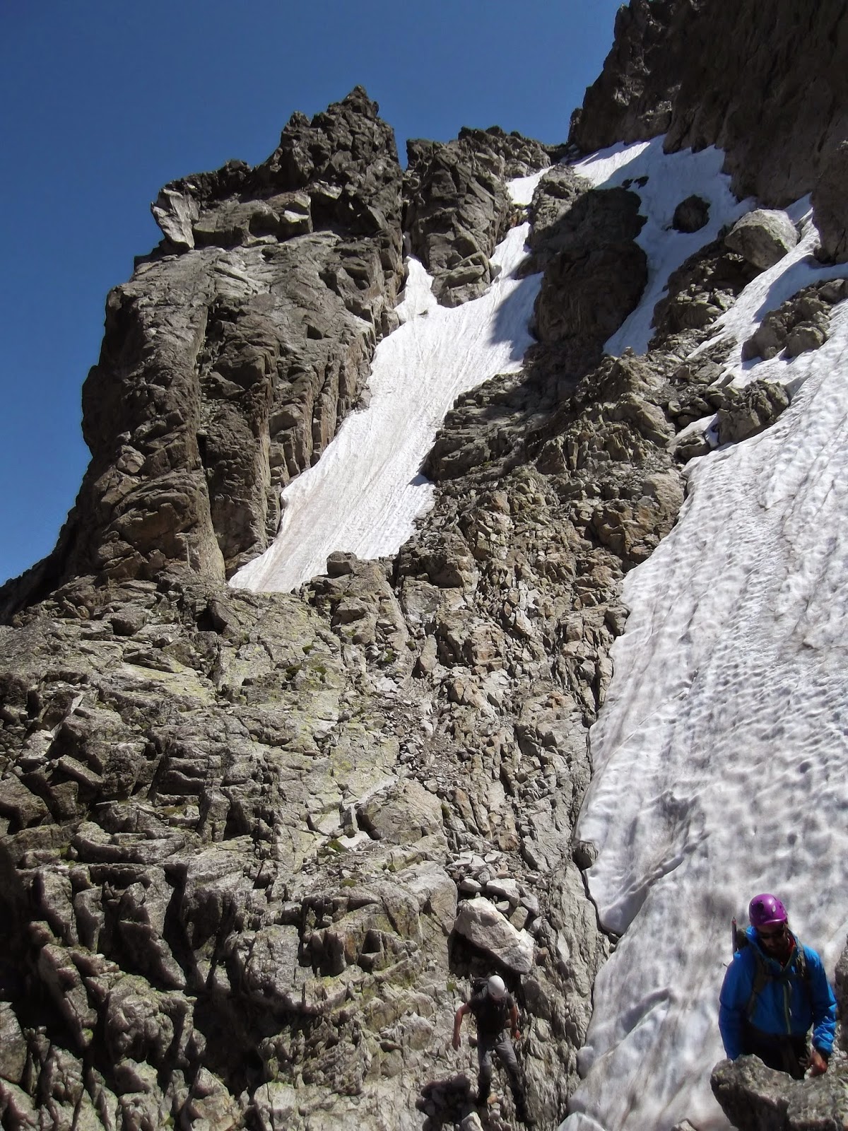 Hem de baixar a la bretxa central fins el peu i remuntar per pedra posant algunes mans.